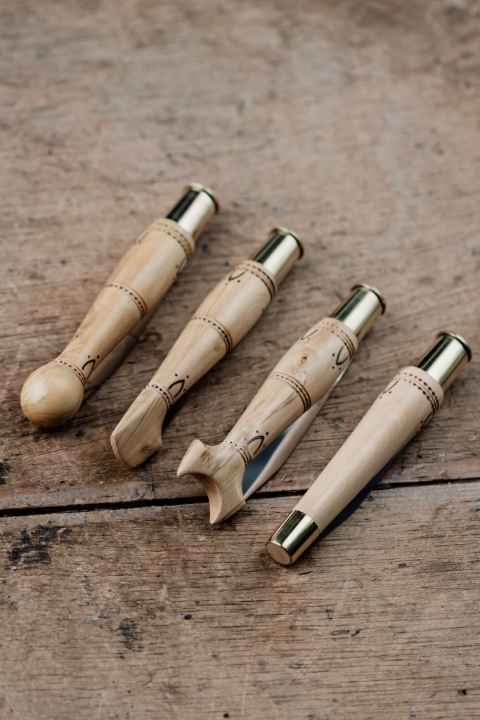 For the handles, all materials are sourced as close as possible and carefully selected. Boxwood grows everywhere in this part of the Dordogne and has been used in the making of the handles since the fifteenth century. After a minimum of four years in the open dryer at the factory, the wood is then turned to give the shape of the desired handle before being finished by hand. Other precious woods and more contemporary materials are also used. The shape of the handle is either a carp tail, hoof, ball or cap.