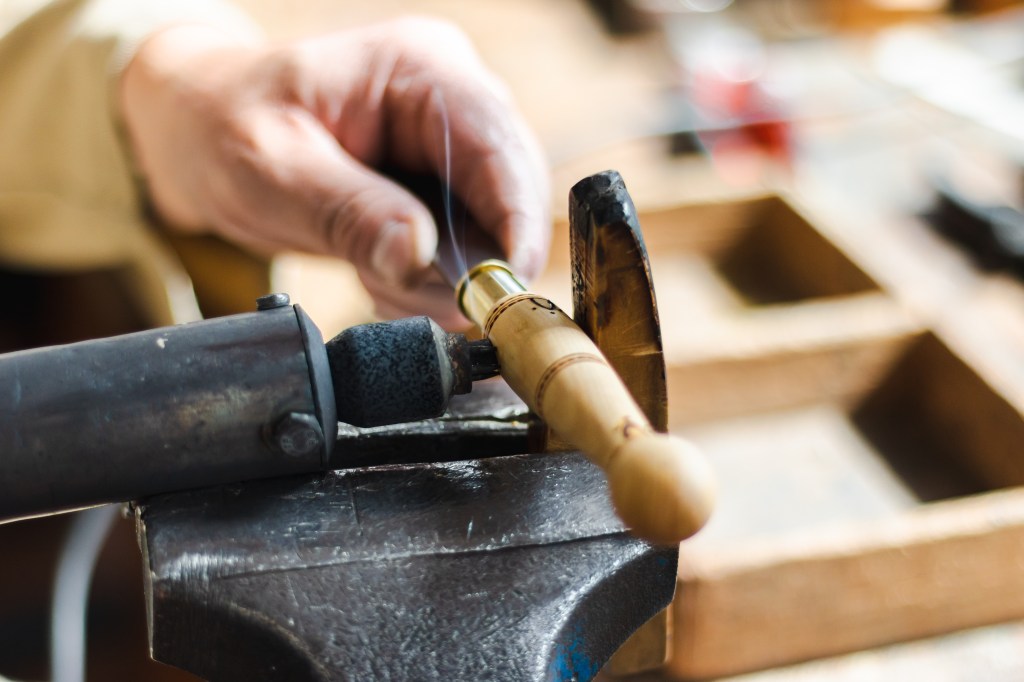 After being assembled, the boxwood knives are decorated with the signature burn marks which, for a traditional Nontron knife, is generally four rows of dots and five flies.