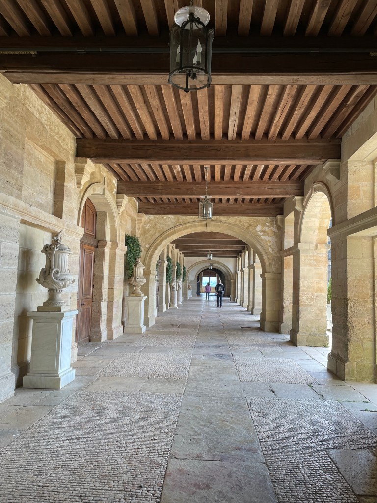 From the main courtyard, the vista sweeps across the formal gardens, the village below, and the rolling valley beyond.