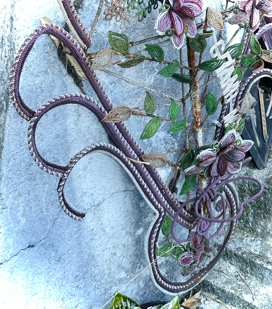 The work involved threading tiny glass pearls onto a long silver or gold twisted wire that was then applied to a design. The wire could be up to 15 metres long so the women had to sit up high to accommodate the length of the wire.