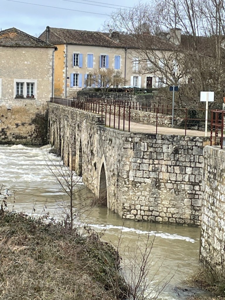 This week, I just needed to get out of the house and clear my head, and so on the first day when the rain finally stopped, I went in search of a small dose of culture. As is so often the case in the Dordogne, you hardly have to travel far to stumble upon something fascinating. Just next door to Eymet, across the boundary into the Lot-et-Garonne, lies the quiet village of La Sauvetat-du-Dropt. There, tucked away beside the river, stands the Pont des Pèlerins, a remarkable medieval bridge made up of eleven Romanesque arches and twelve Gothic ones. It once guided pilgrims along the ancient route to Santiago de Compostela, and has been classified as a historical monument since 1992. Walking its worn stones on a crisp January morning felt like stepping quietly into the past, it was just the reset I needed.